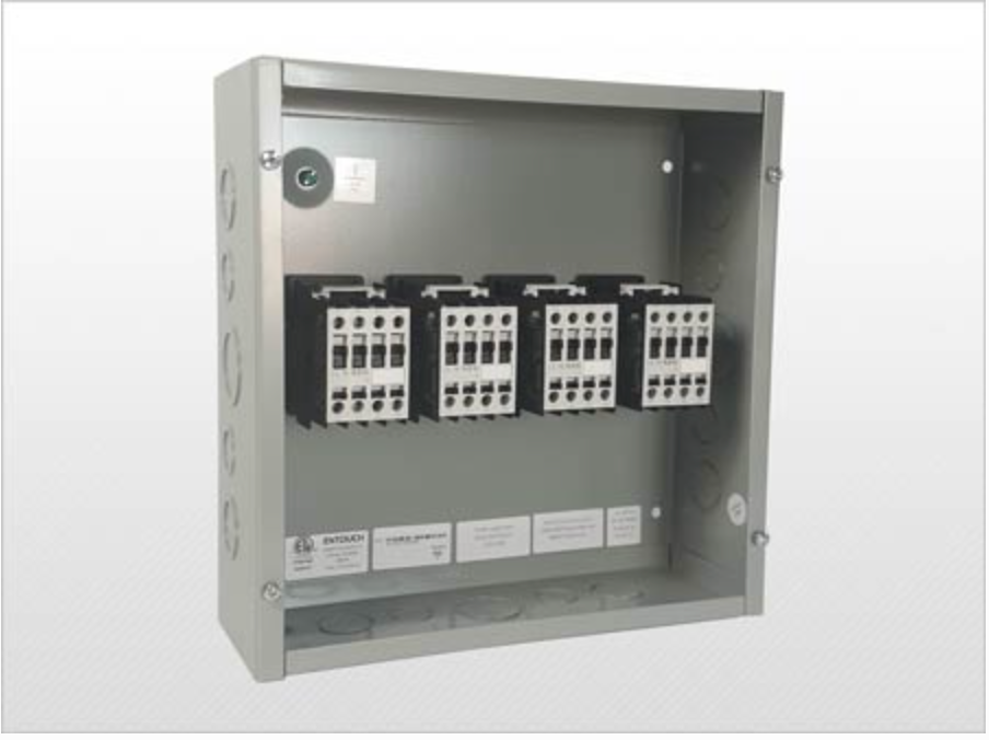 The ENTOUCH Lighting Contactor box is the turnkey solution for load monitoring and management. A bolt-on to the LCM, the LCB effortlessly integrates up to four loads in a sturdy, safe enclosure.